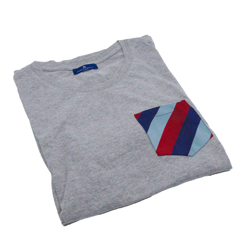 A classy sky-grey t-shirt with a silk pocket in Old Brightonians colours, perfect for occasions where a bow-tie might not cut it.